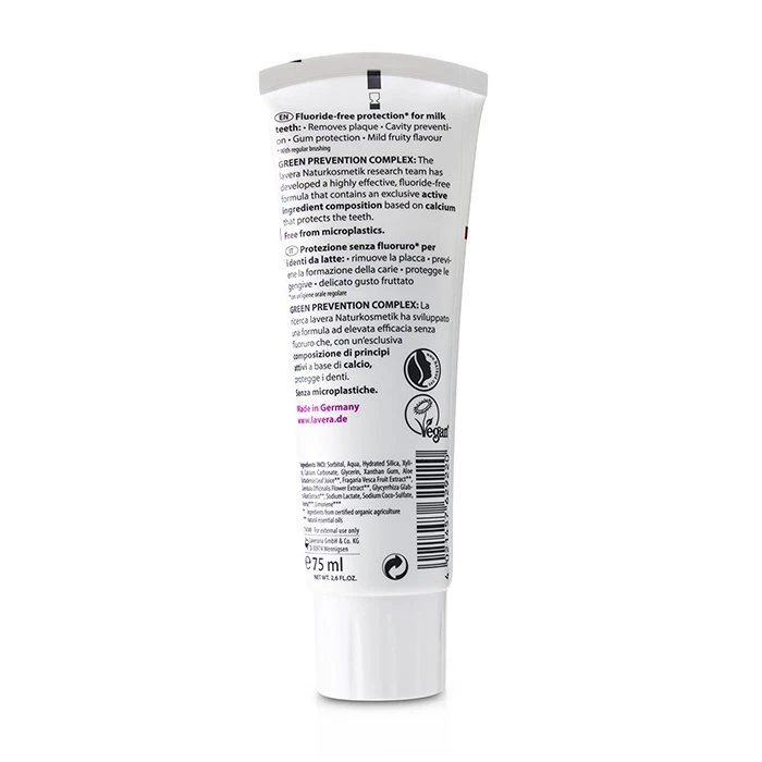 KIDS Cavity prevention for milk teeth Without fluoride & without colourants Mild fruity flavour With Organic calendula & calcium Toothpaste GREEN PREVENTION COMPLEX: The lavera Naturkosmetik research team has developed a highly effective fluoride-free formula that contains an exclusive active ingredient composition based on calcium that protects the teeth.